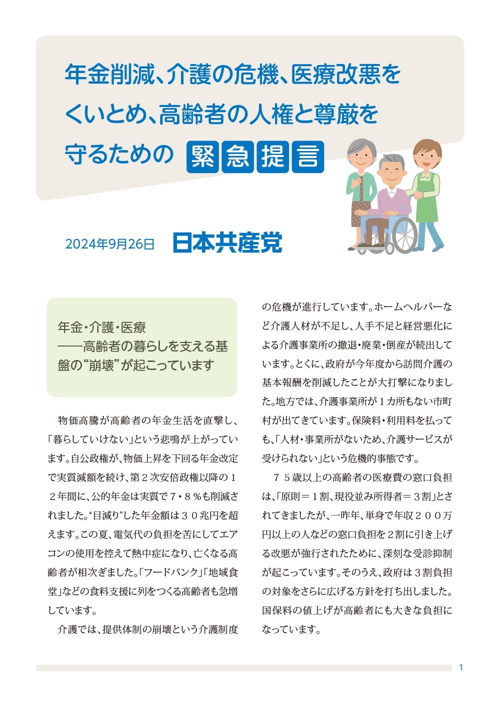 日本共産党は、年金削減、介護の危機、医療の改悪をくいとめ、高齢者の人権と尊厳を守るため、緊急の提言を行います。